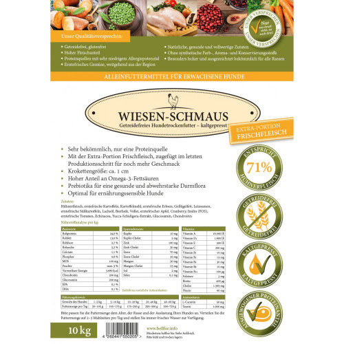BELLFOR Wiesen-Schmaus - kaltgepresstes Trockenfutter für Hunde mit Huhn getreidefrei 10 kg