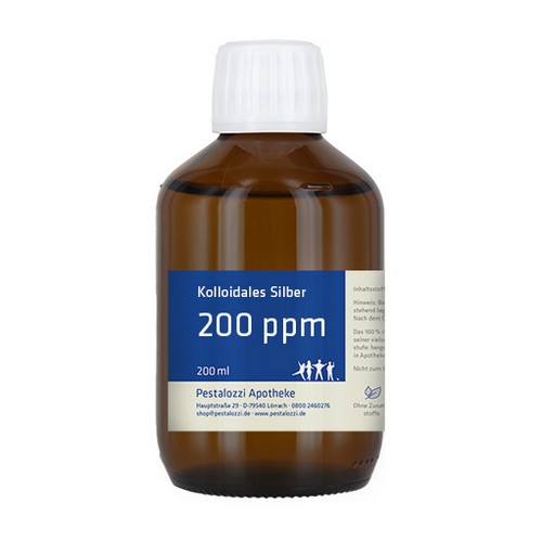 Das kolloidale Silber 200 ppm wird mit hochreinem destillierten Wasser unter qualifizierten Laborbedingungen frisch hergestellt und in einer dunklen Glasflasche geliefert. Die Herstellung erfolgt in der Apotheke unter überwachten Laborbedingungen. Das kolloidale Silber wird auf elektrolytischem Wege mit Hilfe eines entsprechenden Generators hergestellt. Dabei werden aus 99,99% reinem Silber kleinste Partikel gebildet und in destilliertem Wasser verteilt. Wir arbeiten dabei ohne Einsatz von Zusatzstoffen. Bitte beachten Sie: Kolloidales Silber ist kein Arzneimittel und daher auch ohne Angabe einer Indikation. Aus rechtlichen Gründen bieten wir daher das kolloidale Silber nur für technische Zwecke an. Nicht zum Einnehmen.
