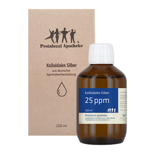 Das kolloidale Silber 25 ppm wird mit hochreinem destillierten Wasser unter qualifizierten Laborbedingungen frisch hergestellt und in einer dunklen Glasflasche geliefert. Die Herstellung erfolgt in der Apotheke unter überwachten Laborbedingungen. Das kolloidale Silber wird auf elektrolytischem Wege mit Hilfe eines entsprechenden Generators hergestellt. Dabei werden aus 99,99% reinem Silber kleinste Partikel gebildet und in destilliertem Wasser verteilt. Wir arbeiten dabei ohne Einsatz von Zusatzstoffen. Bitte beachten Sie: Kolloidales Silber ist kein Arzneimittel und daher auch ohne Angabe einer Indikation. Aus rechtlichen Gründen bieten wir daher das kolloidale Silber nur für technische Zwecke an. Nicht zum Einnehmen.