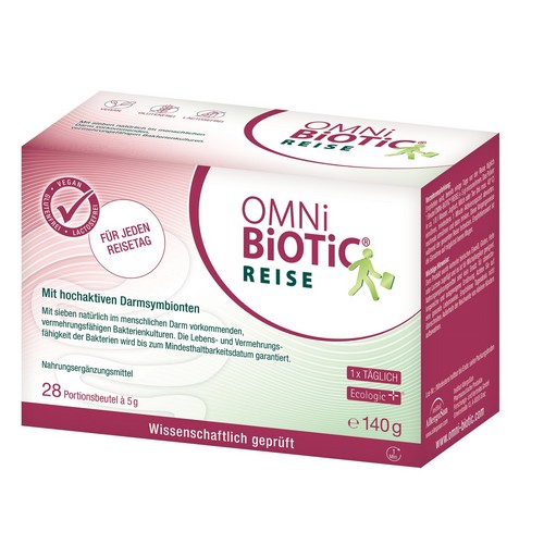 Empfohlen wird, bereits einige Tage vor der Reise täglich 1 Beutel OMNi-BiOTiC® REISE (= 5 g) einzunehmen. Das Pulver in ca. 1/8 l Wasser oder auch (verdünnten) Fruchtsaft,Milch, Tee (bis max. 40° C), Joghurt o. Ä. einrühren, mindestens 1 Minute Aktivierungszeit abwarten, nochmals umrühren und dann verzehren. Diese Vorgangsweise während der gesamten Reise fortsetzen.