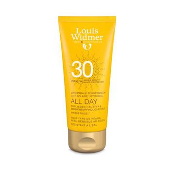 Dank hoch entwickelter Liposomen-Technologie ist es möglich, UVA- und UVB-Filter in die Monolayer-Liposomen einzuarbeiten. Diese Liposomen dringen tiefin die Hornschicht ein und bieten deshalb einen lang andauernden Schutz vor UV-Strahlen, auch bei regelmässigem Wasserkontakt. Durch die hohe Konzentration an Monolayer-Liposomen ist eine homogene Verteilung der UV-Filter in der gesamten Hornschicht gewährleistet. Die Gel-Grundlage enthält zusätzlich UVA- und UVB-Filter. All Day 30 gewährt einen hohen Schutz vor UVA- und UVB-Strahlen. All Day 30 pflegt und befeuchtet die Haut. Es wird auch von der sehr empfindlichen Haut gut vertragen. Vitamin E schützt vor der schädlichen Wirkung freier Radikale und reduziert durch UV-Strahlung bedingte frühzeitige Hautalterung und Hautschäden. Es stimuliert die hauteigenen Repair-Mechanismen. Panthenol verbessert das Feuchthaltevermögen der Haut und wirkt normalisierend.